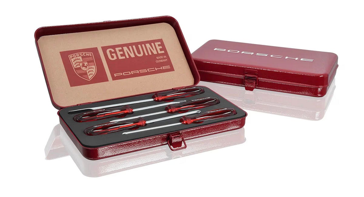 If you’re going to do your own work on your classic vehicle, why not do it with vintage tools? This 5-piece screwdriver set from Porsche Classic is based on those found in the factory toolkit from the mid ‘60s through the early ’70s. Made in Germany, they include a steel storage container with a red hammer-tone finish, lending a nostalgic charm to your tool chest.